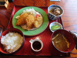 朝6時には起きだし、7時過ぎに食事の準備。うどんを湯がいて2人で朝食とする。8時には能登事務所を出て、志賀町役場を目指す。のと里山海道では、ゆっくりなトラックが何度か前を走り、ぎりぎりになりそうでしたが、最後に挽回し約束の時間に間に合う。移住担当や創業支援の担当者と相談。その後、役場で紹介された福浦港界隈を散策、商工会で車について相談、紹介いただいたお店へお願いに。昼食を能州富来の味処 久治(昔の満升の店を別の方が活用)でいただく。午後は増穂浦海岸でさくら貝をながめ、観光協会の事務所に顔を出す。宝達志水町で内海さんのいちじく畑訪問の後、県庁で経営支援課と地域振興課で相談。金沢駅までお送りしてサポート終了。 | ![]() 久治の日替わりランチ |