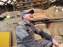 朝5時過ぎには起きだし、囲炉裏の灰をかけてあった炭火の灰をどかして、新たな炭を加えて炭火が移るのを眺める。不思議な現象ですが、昔ながらの炭火のある暮らしです。学生諸君と先生が起きてきて、一緒に朝食をいただくが、珪藻土コンロに炭火を移して、カレイを焼いて食べていただく。彼らが輪島方向に向かって出発した後、事務所前の雪山を崩して、雪を動かす。前面に余裕を持って止められるようなりました。昼には餅を炭火で焼いていただく。午後は、昨日炭を買わせていただいた池下さんのところを訪ね、追加で炭を分けていただき、軽トラで炭窯まで連れていっていただきました。ご自宅のすぐ裏山に窯が設けられていて、窯前でご主人の池下巽さんにお話をうかがう。当目の小箱政治さん(故人)の炭窯が2007年の能登半島地震で崩れたので、その再建を手伝ったことを契機に炭焼きを始められています。炭窯づくりについても指導いただいたとのことです。2024年元旦の地震の時も、窯前におられ、窯の前部が崩れるのを近くで見ていたそうで、コンクリと金属で補強されています。門前の森さんとも交流があるようで、「えちゃけ」2号を見せていただきました。元気に炭焼きを続けていただき、息子さんに継いでいただければと思う。能海山市場とスーパーしんやで買い物をして戻る。本日は煮物を作り、学生諸君が戻ってから、夕食を一緒に楽しむ。炭火であぶって食べるものをいろいろ購入してきてくれていたので、楽しんでいただけました。炭が役立っていました。 | ![]() 池下巽さん |