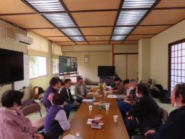 早朝に起きて、書類を複数作成し、メール送信。ひと眠りした後、6時前に起きて朝食。6時半過ぎには家を出て能登へ。能登事務所には9時前に到着、炭火をおこし、掃除。10時過ぎには、日本大学の先生方5名が能登事務所へ。囲炉裏の近くにお座りいただき、お話をさせていただく。10時45分には能登事務所から弁当の愛里さんに行き、弁当を預かって戻る。岩井戸公民館に届けて、能登事務所に戻り、話の続きを。11時半前には、公民館長より電話があったので、先生方と公民館に移動し、弁当を配り、趣旨を説明し、食事をしながら話をうかがう。食事終了後、ヒアリングを行っていただく。震災は衝撃が強かったことがうかがえました。帰省していた子どもたちが、実家に泊まらず帰るとか、玄関脇の部屋に、いざという時に持ってでる鞄を置いてあるなど、震災を受けての話がリアルです。災害公営住宅の話も定まっていないようで着工もしていないようです。仮設にお住いの方の今後が不透明な印象でした。能登事務所に戻り、追加でお話をさせていただき、お帰りいただく。一旦金沢に戻られて、明日改めて能登に来られるとのこと。メンバーが交代する方がおられるので仕方ないか。 | ![]() 岩井戸公民館で |
