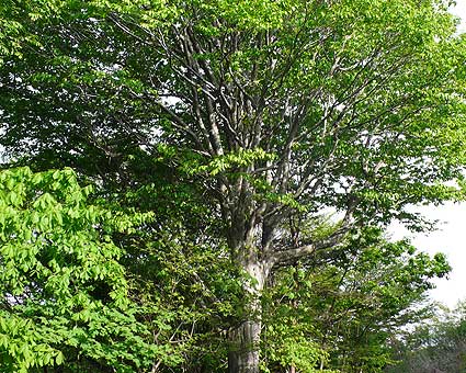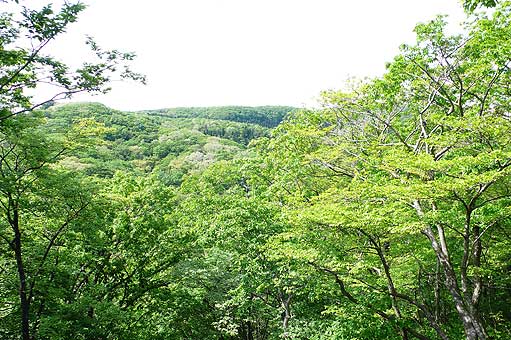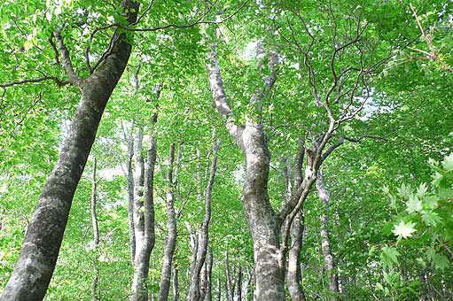 | ■高洲山のブナ林(輪島市) 輪島市街から千枚田、曽々木に向かう途中を右に上がっていくと高洲山があります。幹線道路からの入り口には小さな案内の柱が立っている程度なのでよく見ていないと見過ごしそうです。高洲山の頂上には自衛隊のレーダーがあるので、立ち入り禁止の看板もあるが、それを無視してあがると、ブナ林の手前の右手に駐車場があります。ブナ林への入口は駐車場の入口のすぐそばにあるので、そこからは遊歩道があるから、気軽にブナ林散策が楽しめます。能登のブナ林の中では最も入りやすい場所でしょう。