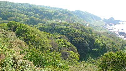 | ■半島先端の海(珠洲市) 能登半島の先端の道路を走っていると、綺麗な海を眺める ことができるポイントがいくつもあります。能登半島里山里海自然学校がある小泊の集落から少し南に下った地点で見つけた海です。青い海が印象的でした