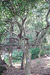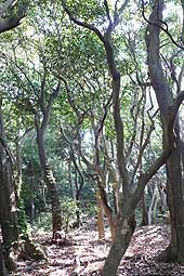 | ■徳保の千本椿(珠洲市) 木ノ浦の通称ラケット道路沿いにある駐車場に車を停め、ガードレールの切れた所から下りていくことができます。徳保八幡神社の社叢林は、「徳保の千本椿」と呼ばれています。林内に入ると鬱蒼としていて、多くのヤブツバキが林立しています。タブノキ、ケヤキ、ケンポナシ、ヤブニッケイなども生えています。