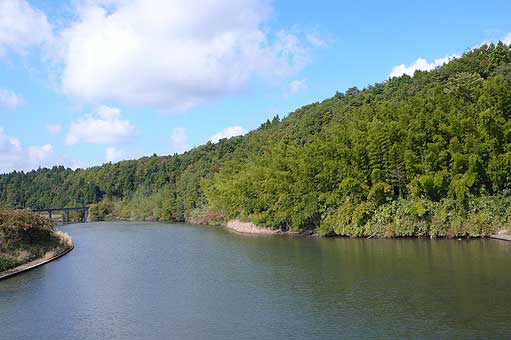 | ■内浦の河口の風景(能登町) 小木から九十九湾を抜け、松波に向かう途中の橋の上からの眺め。かつては奥の鉄橋の上を列車が走っていたが、今は鉄橋だけが残っています。河口近くなので、いつも水面はなだらかで、山の緑が写っています。鉄橋の奥には別の橋があり、そこからの眺めもよい。浅い川を魚が泳ぎ、サギが魚をねらっていたりします。