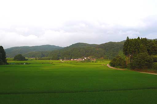 | ■半島の真ん中の農村風景(能登町) 奥能登の真ん中、柳田には素晴らしい風景を眺められるところがいくつもあります。「となりのトトロ」の映画に出てくるような所だと言う方も多い。ネコバスで軽く越えられそうな小高い山や水田を吹き渡る風、蛇行した川や舗装されていない道なども見られます。