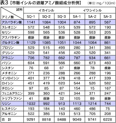 表2から「いしり」の主な有機酸は乳酸であること、表3から旨みの素である遊離アミノ酸が非常に多く含まれていることが分かります。(資料提供:道畠俊英)