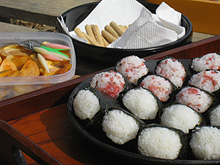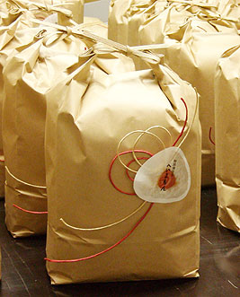 今年はパッケージデザインから飾りづくり、梱包まで、女性スタッフを中心に行なったのですが、お米の量が倍になったため予想していたよりも大変な作業でした。米袋のパッケージには紅白の水引に見立てた紙紐をあしらい、「へいよもん」おにぎりを飾りました。