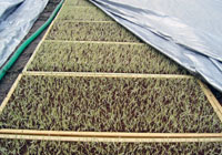 種まき、苗を育てる ●種まき ●苗を育てる 育苗箱の土から芽が出たころに、ビニールハウスに移し、ハウス内の温度などに気をつけながら、水と肥料を与えます。 田植えの準備