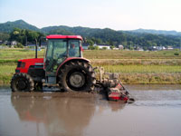 ●田おこし 田んぼに堆肥などの肥料をまき、土を耕し、肥料分と混ぜ、酸素を吸わせます。 ●代かき 田んぼに水を引き込み、土を平らにし、水の深さをそろえます。