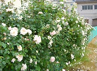 026-白バラの垣根 JR西金沢駅と1コめのバス停の間くらい。荷さばき倉庫への引き込みゾーンが、なぜか白バラの咲き乱れる垣根で彩られております。この奥ではヘルメットにドカジャン姿のお父ちゃんたちがリフトで作業してたりするので、その様子がバラ越しに見えるのです。(2006.06.01.Thu) |