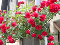 027-赤バラのアーチ これは、JR西金沢駅からのバスルートからちょいと裏通りに入ったあたりの住宅地。実際にアーチ型に仕立ててあるわけではないけれど、枝が伸びてアーチのように見えるほどになってます。昨日の白バラはもう終わりがけだったけど、こっちは花盛りです。いやぁ、自分で毛虫退治しなくても、きれいなバラが見られるってありがたいもんですね。(2006.06.02.Fri) |