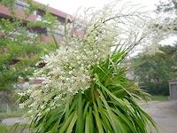 034-よく分からない葉もの 西金沢駅から金沢高校へ向かう途中のマンション前のゾーンに植わってました。バスの窓から遠目に一見した感じはパンパスグラスを思わせたので、植栽効果としても近いところを狙えそう(?)ですが、パンパスグラスってのは頭の部分がもっとふわふわした秋のものみたいですね。これは下の方がランっぽくて、よりアジアな感じもします。(2006.06.14.Wed) |