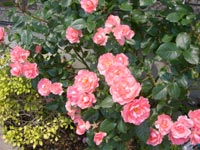 028-サーモンピンクのバラ 通勤ルートじゃないけど、せっかくバラが続いたので入れました。先週会社にやってきた新車のために車屋さんに買いものに行ったら、隣のお宅が花盛りでした。写真の左上方は窓なんですが、カメラ構えてたら、高級そうな室内ワンちゃんがカーテンをのれんのようにくぐって登場し、撮影ぶりを観察されてしまいました。(2006.06.05.Mon) |