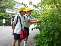 031[番外編・実の巻]-グミ収穫ブーム 会社前の実生のグミが赤く色づき、目ざとい小学生男子くんたちの下校おやつになっています。今どきの子はもはや、その辺に生えているものを採って食うなんてideaを持っていないのかと思ったら、まだまだ日本人も捨てたもんではないですね。ちなみにこの木の足元辺りにあるワイルドストロベリー(同じく実生)は女子に人気です。(2006.06.09.Fri) |
