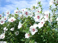 045-ムクゲの八重咲き品種かな JR小舞子駅に停車したときに見える、線路沿いの民家の門前の木。先日、車で出たときに近くから見たところ、実はこんな八重咲きだったことが判明しました。(2006.07.25.Tue) |