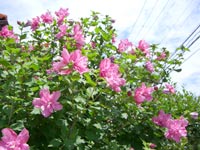 049-夏ムード満載のムクゲ 毎日バスの窓から見てるムクゲの写真を撮りそびれている間に、よそのムクゲを写してきてしまった。小松の梯川に近い用水沿い。ムクゲってハイビスカスの仲間らしいんですが、これ見るとむべなるかな〜って感じですね。(2006.07.31.Mon) |