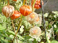 076-完成ほおずき 時々ランチにでかける蕎麦屋さんの店先。手入れのよい花壇に、いつもいろんなお花が咲いています。この日は、きれいに葉脈だけ残ったほおずきの中にツヤツヤの赤い実が透けて見えるという、まさに出来上がり状態となっていました。この久安の蕎麦屋さん、裏通りにひっそりあって、迷いながらじゃないと辿り着けない隠れ蕎麦屋です。(2007.11.30.Fri) |