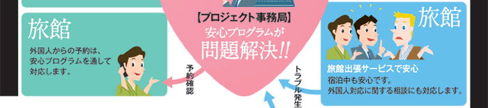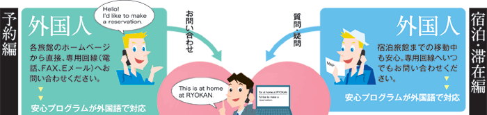 外国人のお客様からの宿泊ご予約やお問合わせには、“安心プログラム”が、旅館に代わって対応いたします。また、宿泊・滞在中の外国人からの質問、および旅館側の困りごとについても、“安心プログラム”が対応いたします。