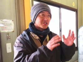 朝6時過ぎには家を出て能登へ。能登事務所に立ち寄り、先日の滞在者が使われたシーツ類を洗濯し干す。9時過ぎには事務所を出て珠洲へ。みなくち農園で取材。まずはお父さんの皆口和寛さんから話をうかがう。途中から息子さんの英樹さんが来られたので、震災当日から最近の活動について話をうかがう。地震のあった元旦からビニールハウスで住民の方々の避難生活がスタート。新たなイチゴ棚を設置するために空いていたビニールハウスに、畳屋さんが畳を持ち込み、建設現場にあった発電機も持ってきてもらい、ファンヒーターも持ち込んだので、ハウス用の電灯もついたとのこと。いちご狩りのお客様用のトイレが使えたので、過ごしやすかったとのこと。大きな釜でお湯を沸かして頭を洗っていたら、ボランティアからお風呂を提供してもらい、お風呂も使えるようになったとのこと。震災後、速やかに農業は再開し、スイカも能登大納言も、コメも植えていたが、9月の豪雨で田んぼの多くが被災。今は焼き芋とさつまいもちっぷすを製造し販売。ネットでも販売されています。いちご狩りは来年から再開予定で、カフェ的な機能も付加する計画です。 | ![]() 皆口英樹さん |