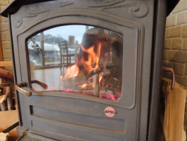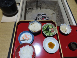 朝5時半ぐらいに金沢を出て能登に向かう。のと里山海道は、羽咋あたりはほとんど雪も無くスムーズでしたが、山間に入ると雪があり、スピードは出せない。穴水に7時半前に到着、すしべんで朝食をいただき、昼食用のおにぎりを購入して能登事務所へ。数日前に雪かきをしたので、駐車場にすぐ止めることができました。事務所内のファンヒーターのスイッチを入れて炭をおこす。雪かきをして駐車場に入りやすくして休憩。流し台の水が出なかったが、お風呂やトイレ、洗面台は大丈夫でしたので、お風呂を追い炊き。流し台の水は出るようになりましたが、お湯が出ないので、お湯を沸かして、蛇口を温めてみましたが駄目でした。掃除機をかけ、布団をセットし、乾燥機をかける。午後3時過ぎに穴水へ買い物に出掛ける。農協直売所で星野さんの豆腐や岩井戸農産のしいたけなどを購入。ホームセンターでファンヒーターと灯油を購入。どんたくで夕食の材料を購入して事務所に戻る。5時前には、本日滞在予定の二人が到着。お風呂に入ってもらい、夕食の準備。とり野菜鍋などを作り、囲炉裏の回りで御膳を並べ夕食を。炭火のある暮らしを楽しんでいただけて何よりでした。明日の朝が早いとのことで早めに切り上げて寝る。 | ![]() 囲炉裏を囲み御膳で夕食 |