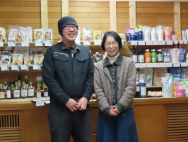 朝8時頃から、能登事務所前の雪山の上にあがり、山の上の部分をいくらか削り落とす。特に雪囲いに負荷が掛っている部分を。9時前に能登事務所を出て輪島へ移動。まずは、ワイプラザ内の出張輪島朝市の様子を拝見に行くが営業している店が少ない印象でした。昔の朝市も冬場はお店が少なったですからね。10時前に辻椀木地木工芸さんへ取材に。弊社スタッフと一緒にお邪魔し夫妻からお話をうかがい工房の中も見学させていただく。ご自宅の一室はうつわと自然食品のショップになっていて、ご主人の作品を展示販売されています。しいのき迎賓館での二人展を拝見していましたが、ようやく正尭(まさたか)さんにお会いすることができました。真澄さんは、シンガーソングライター、絵描き、デザインなどと幅広く活躍されていて、正尭さんの仕事を紹介した漫画が面白いです。CD「Story」も販売中です。11時半には輪島を出て金沢に戻る。家に立ち寄り、灯油を購入してきた後、加賀へ。かりぐらしの家で、掃除機をかけ布団の準備。使用予定の部屋を温めつつ、ガソリンスタンドに灯油を買いにいく。16時40分過ぎに大聖寺駅着の母娘を出迎え、山代温泉にあるおんせん図書館みかんに案内。17時までの営業でしたが、延長して対応いただき、加賀のスタッフにもつきあってもらい、1時間ほど話していただく。マルエーで買い物をしてもらいかりぐらしの家へ。 | ![]() 辻夫妻 |