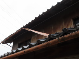 午前は駅西にある会社にお邪魔して相談対応。終了後、宝達志水町へ、まずは暮らし体験の家で洗濯機を回し、区長さん宅を訪ね、区費の(特別賦課金)をお支払いし、空き家のことなどのお話をうかがう。一旦暮らし体験の家に戻り、洗濯したシーツ類を干す。その後、上田出の家に行き、納屋の雨樋が垂れ下がっているのを応急修理。さらに、母屋の瓦がずれていたものを差し替える。お隣の元屋さんが差し込んでいただいていたのですが、少し大きかったようでしたので、納屋のそばにあった瓦に代えてみました。しばらくは大丈夫でしょうか。和倉温泉観光協会長よりお電話をいただき、明日のアポイントが決まったので、急ぎ家に戻り、明日午後の約束を少しずらしていただけるよう連絡。間に合いそうなスケジュールになりました。。 | ![]() 上田出の家の納屋の雨樋 |