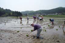 | 5月6日(日) 能都町の瑞穂地区で田植えを体験。My酒倶楽部の活動である。20名ほどで田んぼ1枚を植える。取水口に近い所は深くて大変であったが、ここ数日天気が続いていたおかげで、裸足で入っても温かかった。久しぶりの経験であったが、ぬかるんだ土の感触が気持ち良かった。能都町に行く前に穴水の四季の丘、体験農場の菜の花畑、兼田さんのところに寄る。兼田さんのところでは美味しいコーヒーを御馳走になる。 | ![]() 手で田植え |