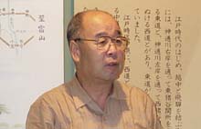 | 9月7日(金) 富山の中央部の商工会地域を回る。細入村、大沢野町、八尾町、婦中町、山田村。魅力的な人はいらっしゃるものです。最初にお邪魔した細入の関所館の館長・中村哲郎さんのお話はいいですね。元は鉱山に勤めておられたという経歴にも興味があります。地味なところですが、館長のお話で十分楽しんでいただけるのではないでしょうか。昼を食べた八尾の風庵のご主人のおわらの時のお話も良かった。婦中町のホウライサンの山藤さんも、面白い農家です。今度の日曜日が収穫祭とのことで、お忙しい最中にお話をうかがう。試飲させていただいたワインは美味しかった。 | ![]() 関所館館長 |