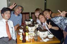 | 9月13日(木) 午前は能登島の教育委員会を訪ね、豊年太鼓や水乞い太鼓について教えていただく。獅子舞の際の「にわか」も面白そうです。田鶴浜の図書館に寄り、獅子舞についての資料をコピーしてもらう。午後は鶴来で白山麓・石川郡の商工会女性部の会合に参加。環境への取組みについて基本的なお話をさせていただく。意欲的な人がいるので面白いプロジェクトになりそうです。夜は駅前の駅亭よこやまで橘女子大学の織田ゼミの学生諸君にこれまで取組んできたことについてお話を。文化とかまちづくりに興味をもっている女性たちなので、少しは伝わったかな? | ![]() 橘女子大のメンバーと |