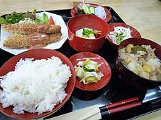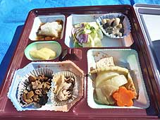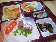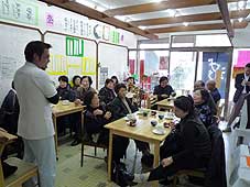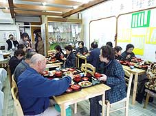 ![]() 朱塗りの器を活かした食事 | ![]() 男性も参加して食事を楽しむ | ![]() 健康講話 |