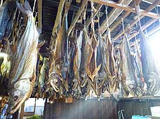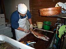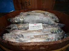 ![]() 鮭の腹をひらく専務の吉川真嗣さん | ![]() 特製の木樽で塩に漬ける | ![]() 昨年から吊されている塩引き鮭 |