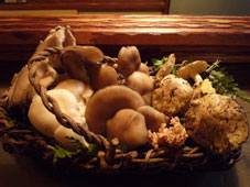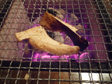 ![]() ご用意いただいたきのこ | ![]() 松茸の炭火焼き | ![]() 食事をいただきながらお話を楽しむ |