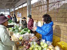 ![]() にぎわう里山市場 | ![]() りんごジュース製造機・アップルサー | ![]() 自然卵の販売も |