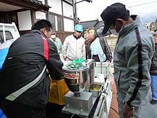 ![]() 最近捕獲された熊を使った熊汁 | ![]() 地元の津田さん作成のかんじき | ![]() 最後のきのこ汁 |