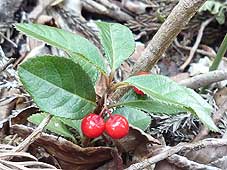 ![]() 法面にたくさんみられたヤブコウジ | ![]() 国土地理院の測量ポイント | ![]() 紅葉したブナの巨木 |