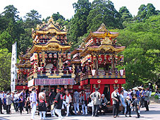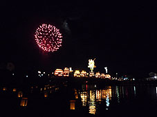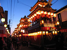 ![]() 南濱町の山車と燈籠山 | ![]() 春日神社の前に揃った山車 | ![]() 吾妻橋に揃った山車・燈籠山と花火、あかり |