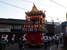 ![]() 南濱町の舞台とその裏を通る各町の山車 | ![]() 空が明るくなってきた中を動く山車 | ![]() 最後の山車が引き上げる |
