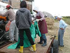 ![]() 順毛久次郎さん | ![]() 脱穀の際にもお手伝いに | ![]() 稲刈り機を操る久次郎さん |