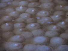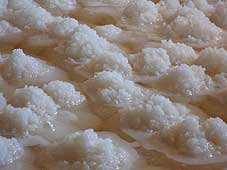 ![]() 規則正しく薪を積む | ![]() おっぱい型の山がいっぱい | ![]() 塩の山ができ上がる |