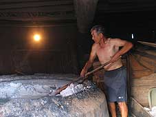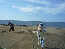 8月6日(金) 塩づくりの現場 | ![]() 中前さんの塩田での砂を集める作業 |