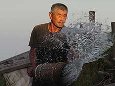 8月9日(月) 何が資源か | ![]() 朝日を浴びながら潮を撒く角花さん |