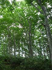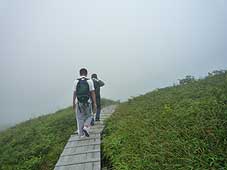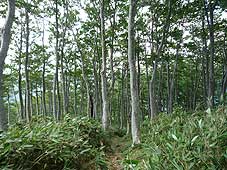 ![]() たくさん咲いていたソバナ | ![]() 霧の中、頂上を目指す | ![]() 若いブナが広がる |