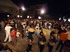 ![]() 手前に畑があり、眼下に街が | ![]() 若宮八幡宮での練習 | ![]() 鏡町での輪踊り |