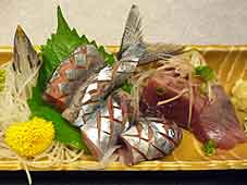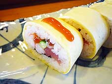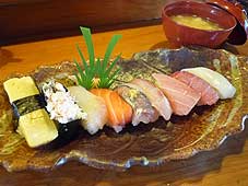 ![]() おむまき(手前の1つに特製ソースを) | ![]() にぎり寿司 | ![]() かっぱ鮨の外観 |