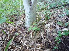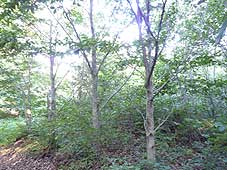 ![]() 神行堂山のブナの森の看板 | ![]() 道沿いのブナ | ![]() 落葉の堆積も進む |
