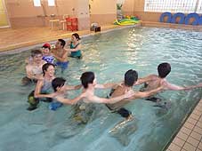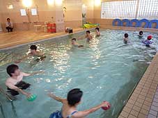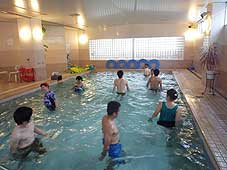![]() 温泉プールの中で歩く | ![]() ボールを使った運動 | ![]() 身体に触れながら楽しく運動 |