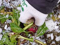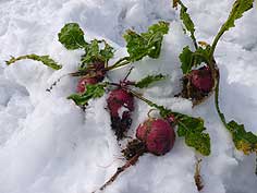 ![]() 雪原を進む | ![]() 赤かぶ発見 | ![]() 雪の上に並べると赤が引き立ちます |