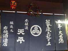 ![]() 布施酒造店の外観 | ![]() 息子さんが描かれた絵がいっぱい | ![]() 代表的銘柄が描かれたのれん |