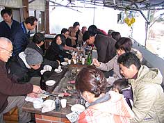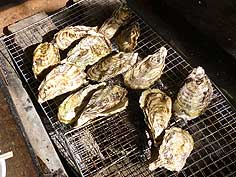 ![]() 数馬酒造での試飲の後 | ![]() 渚水産でかきを炭火で焼く | ![]() 盛り上がるバーベキュー |
