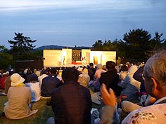 ![]() 手仕事屋での懇親会 | ![]() 手仕事屋でいただいた山菜 | ![]() まんだら村屋外劇場での独演会 |