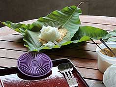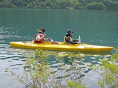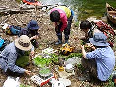 ![]() 朴葉飯を作る | ![]() ボートで漕ぎ出す | ![]() 山菜を調理 |